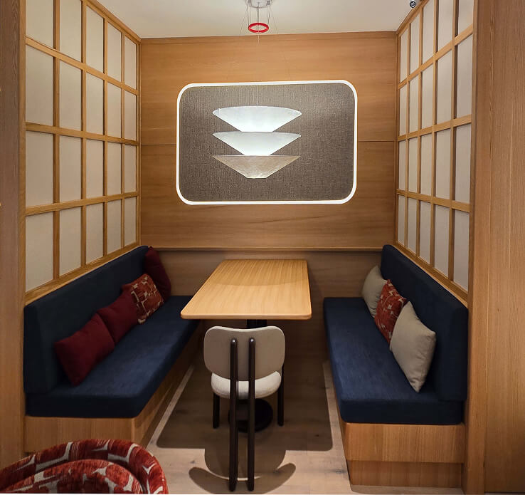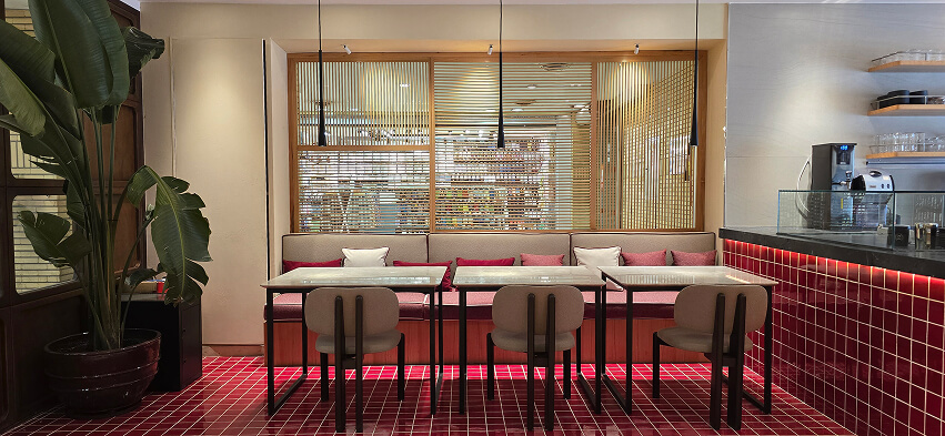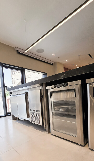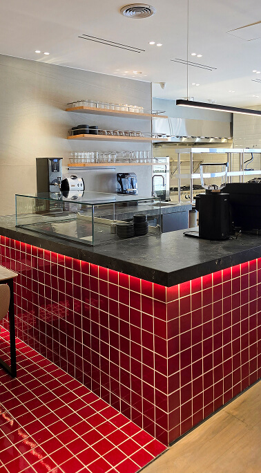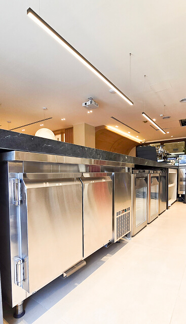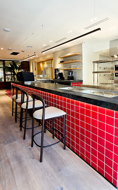 در کانتر جلو از دستگاه تاپینگ برای راهاندازی سالادبار و سرو سوشی استفاده شده است. همچنین در کانتر میانی، تاپینگ جداگانهای جهت آمادهسازی ساندویچها و صبحانههای مجموعه در نظر گرفته شده که پس از آمادهسازی، برای سرو در داخل سالن ارائه میشوند.